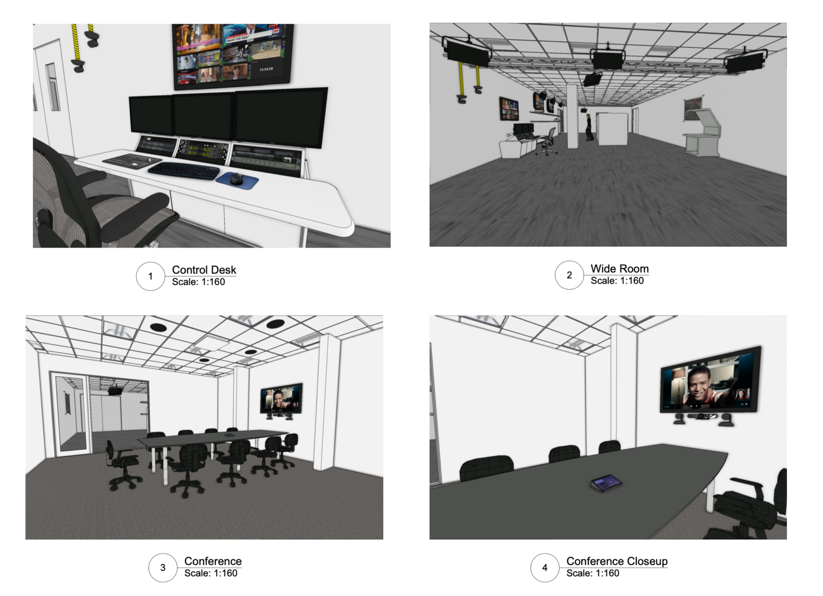 Once we have the 3D models created, we can carefully select textures, viewing angles, and any human or other avatars to give the space a better sense of scale. Our team then can create custom fly throughs of the space with any camera directions you’d like. Whether you’re using these video fly throughs and 3D renders for presentations to your team or to pitch to investors for a new conference room AV setup or studio installation, we make sure your vision is clear and visualized in an exciting way.