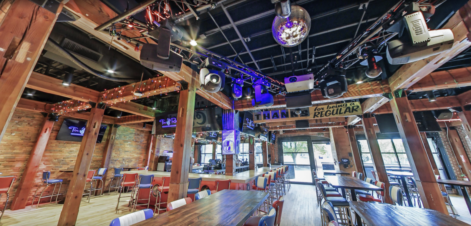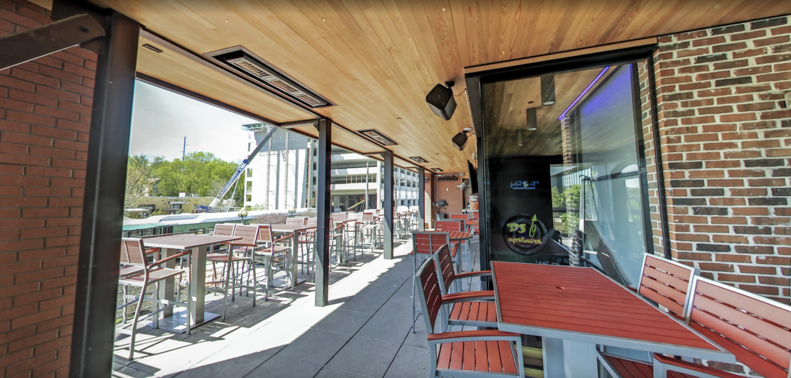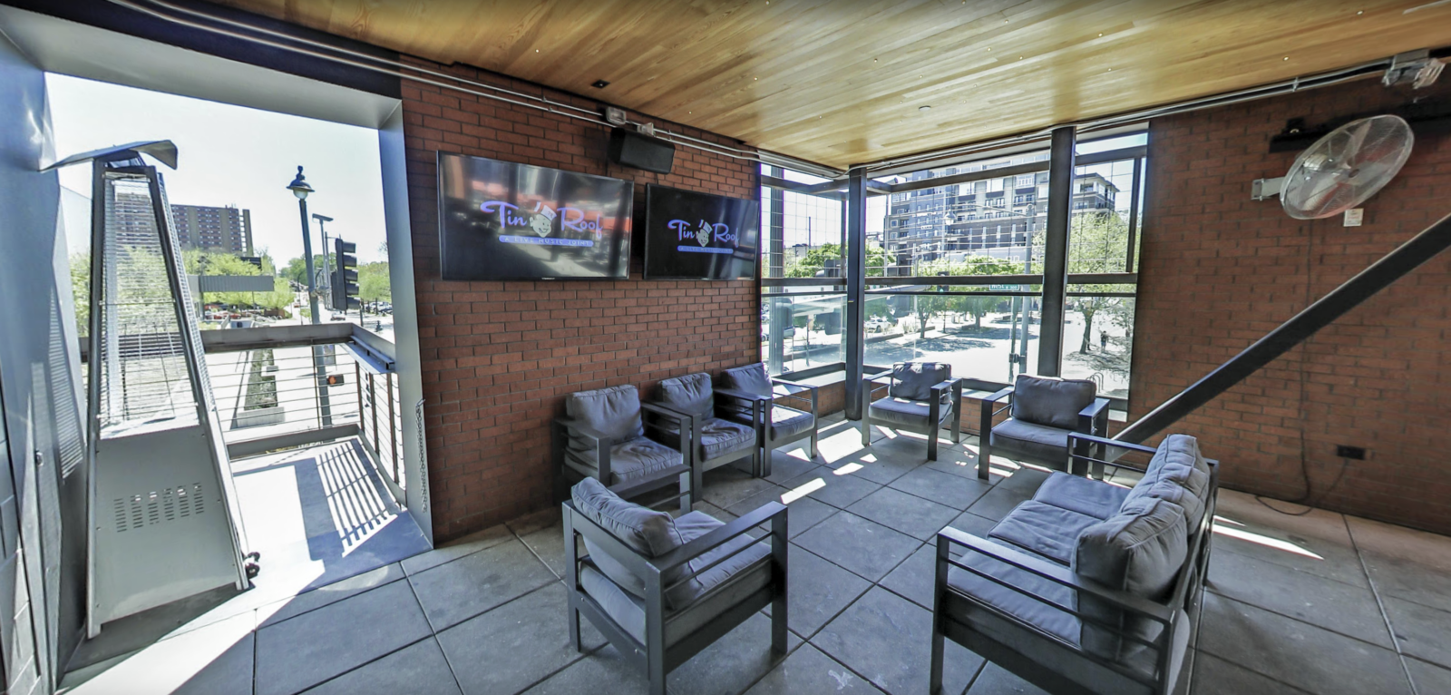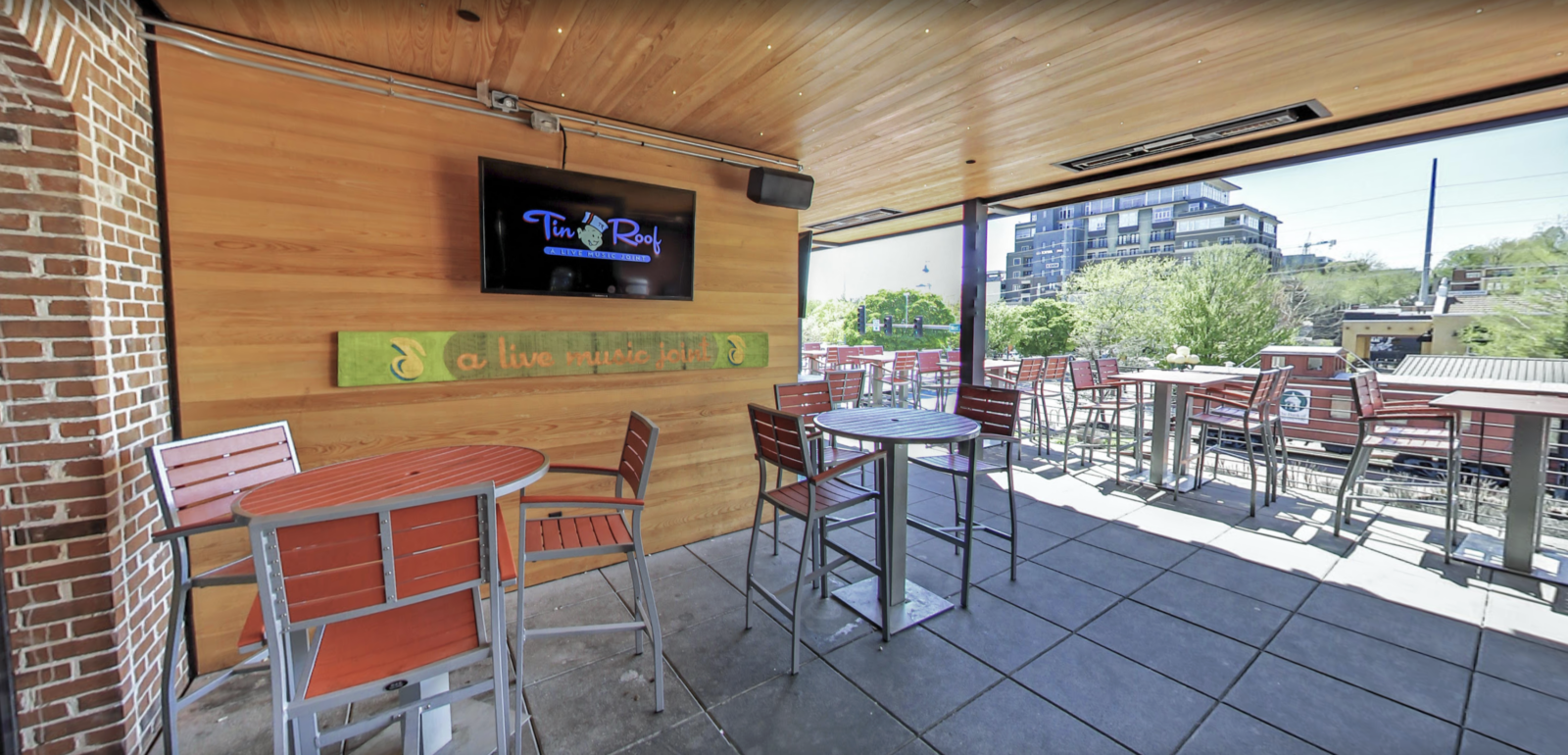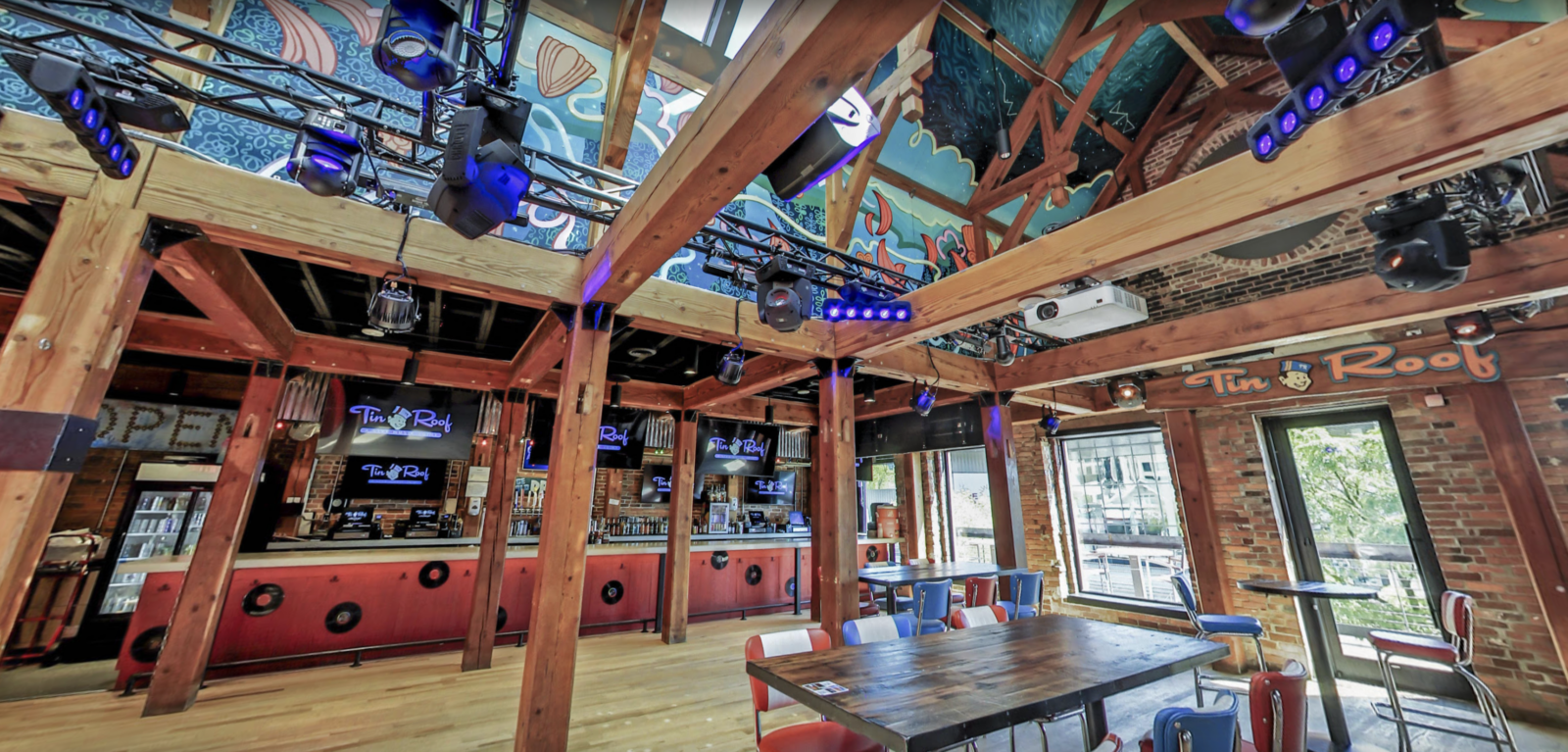 Tin Roof is a well-known restaurant chain that combines great food, live music, and a lively atmosphere. The Fayetteville location is particularly special, featuring an indoor-outdoor design with a large shipping container acting as the centerpiece for the outdoor bar, TVs, and courtyard space. With a second-floor mezzanine overlooking the main area, this location required a sophisticated AV system that could manage sound and visuals seamlessly across multiple zones.